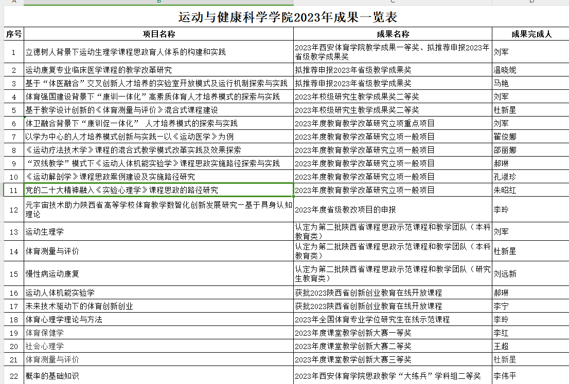 继年初刘军、杜新星2位老师分别负责的运动生理学、体育测量与评价获得省课程思政示范课程和教学团队(本科教育类),刘远新老师负责的《慢性病运动康复》被认定为省课程思政示范课程和教学团队(研究生教育类)之后,近日,陕西省教育厅公布了省级创新创业教育在线开放课程评审结果,郝琳、李宁两位教师申报的《运动人体机能实验学》、《未来技术驱动下的体育创新创业》成功获批。另外,李玲老师《体育心理学理论与方法》获批为2023年全国体育专业学位研究生在线示范课程。