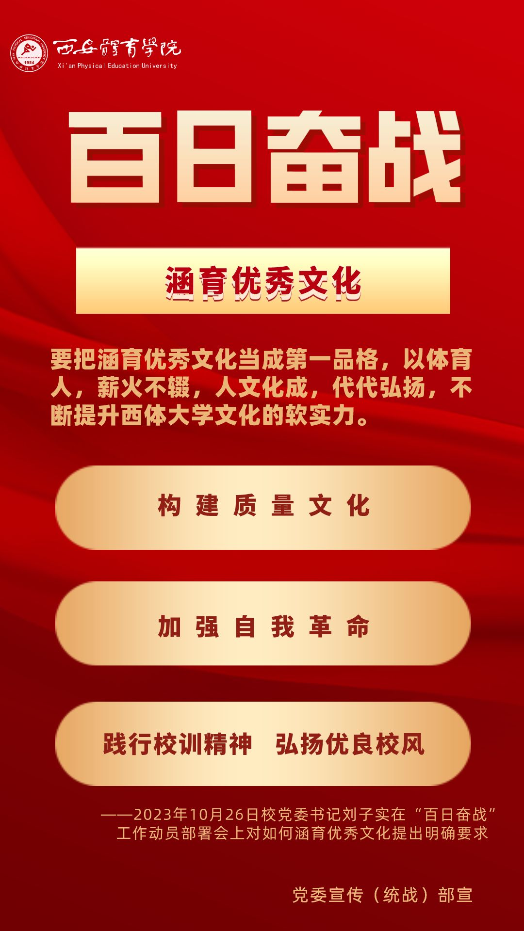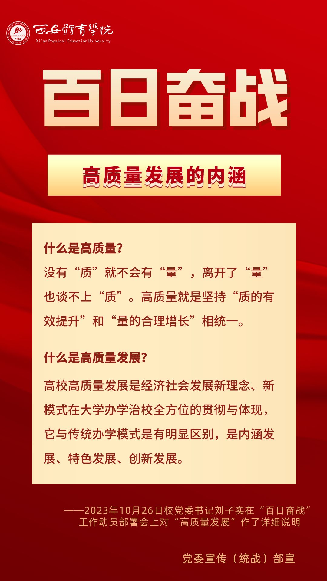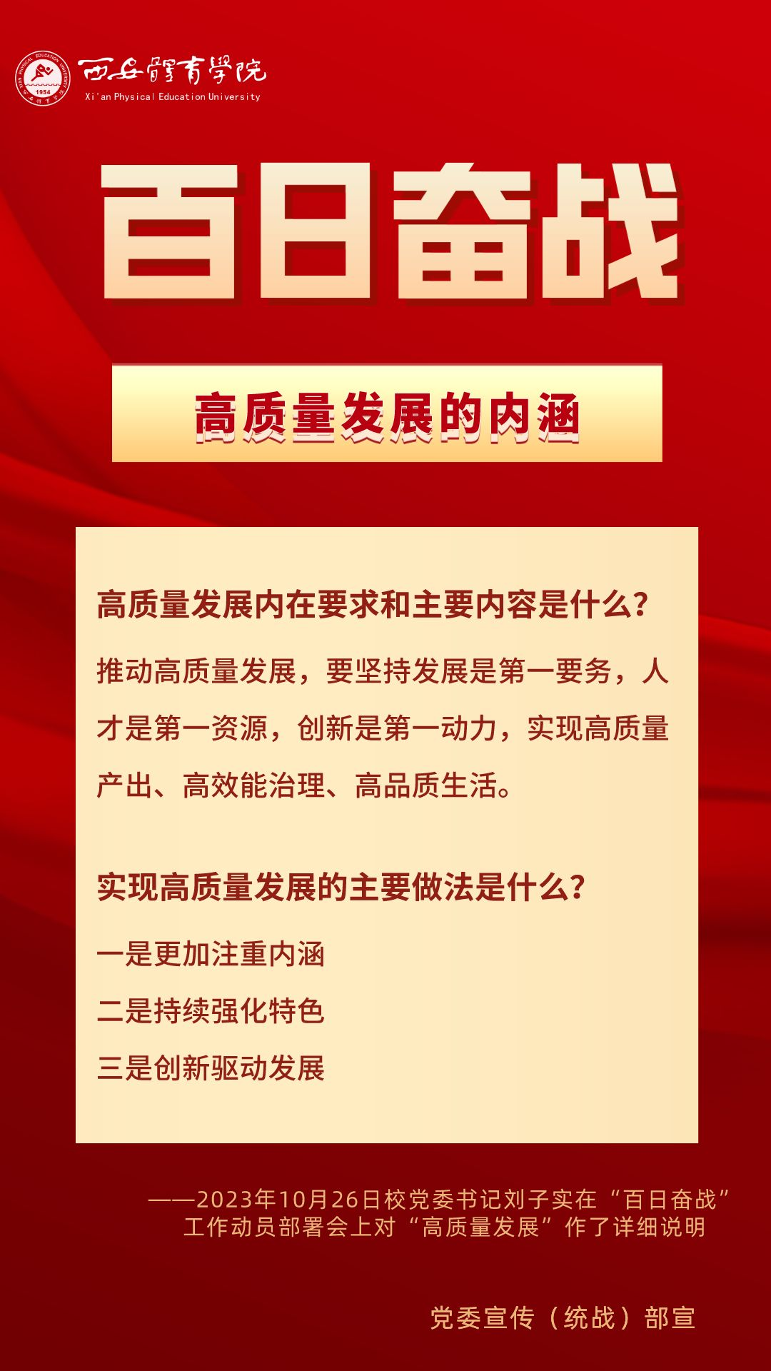 为持续掀起“百日奋战”的热潮,保持学校各项事业高质量发展的战略定力,动员全校师生员工为学校改革发展勠力同心、接续奋斗,本公众号将以专栏形式推出“百个要点”的“百张海报”,将“百日奋战”相关会议的主要会议精神和重点内容进行摘录报道,以供师生员工学习交流。