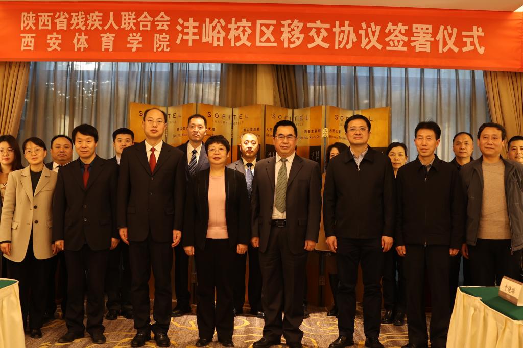 本网讯 12月7日下午,我校与陕西省残疾人联合会在人民大厦顺利完成移交沣峪校区签约仪式。省残联党组书记、理事长刘贤荣,省残联党组成员副理事长童博与我校校长李富生、副校长张卫国出席移交仪式。