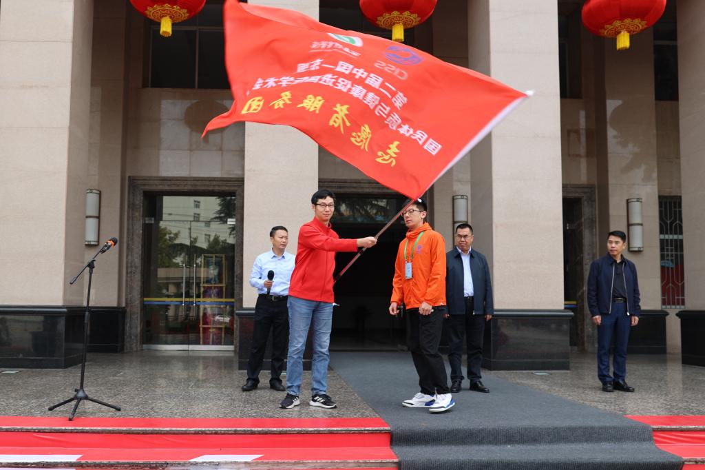 冯强为久久不卡区第二届中国—东盟国民体质与健康促进国际学术会议志愿者服务队授旗。