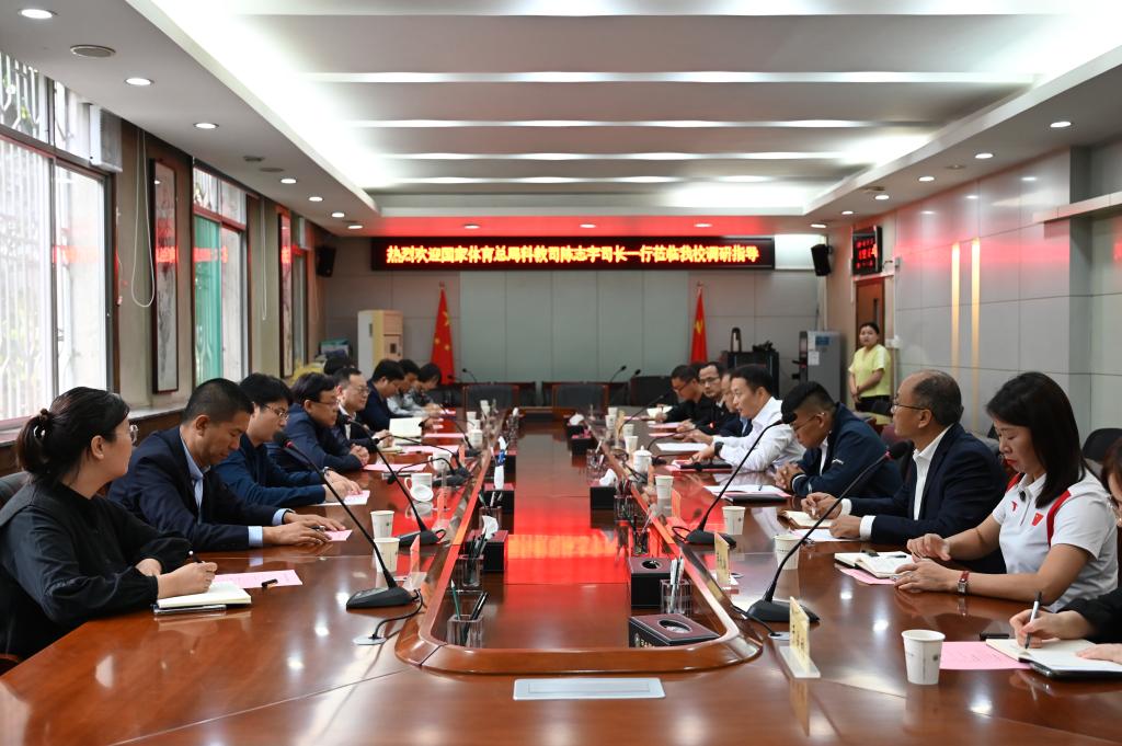 本网讯 10月9日,国家体育总局科教司司长陈志宇、科教司综合处三级调研员金鑫、教育处三级主任科员崔晓飞一行到我校考察调研并进行座谈交流。我校党委书记刘子实、党委副书记马海涛及相关部门负责人陪同调研。
