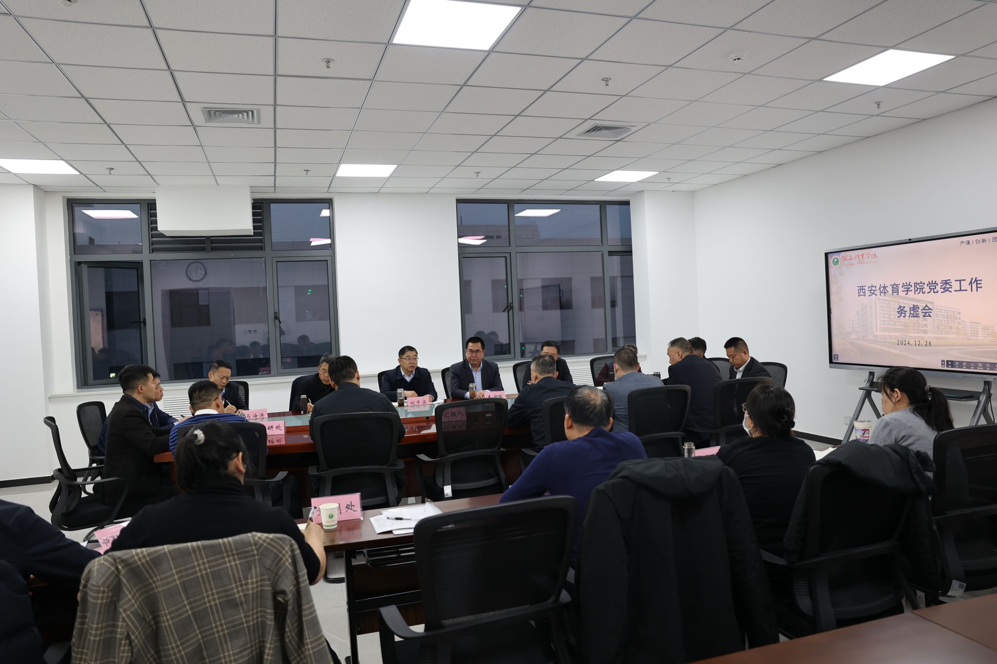 校长李富生重点从工作总结与体会、明年重点任务安排、工作建议等方面进行交流发言。他指出,2024年是建校70周年,是学校发展史上里程碑式的一年,是鄠邑校区转为主校区、实现主体搬迁、踏上二次创业新征程、奋力实现高质量内涵式发展的极不寻常的一年,我们坚持以改革破解难题、以发展解决矛盾,学校整体面貌变化大,社会各界影响大、反响好,赢得了师生、社会、上级、校友的广泛赞誉。我们全年奋斗不息,通过提质增效,通过快节奏的工作实现了“十大改革发展工程”取得良好成效,比如建成全国首个集手曲棒垒橄高标准现代化赛场集群,建成全国首座集教学科研图书实验校史展览一体化的高标准现代化教学办公综合大楼,建成全国首座有抗震支座的现代化学生宿舍,成为全国首家与中国足协共建足球学院的体育学院,挂牌成立全国首家体教融合研究中心,成为全国首所承办女子垒球亚洲杯赛的高校,成为全国教学训练场地设施非常先进的体育院校之一, 成为全国首个校区主体搬迁速度最快的高校之一,成为举办全国最具特色校庆系列活动的高校之一,成为短期内改革力度最大的高校之一。这些成绩的取得靠的是守正创新、自强自立、上下齐心、真抓实干。对于明年的工作,李富生指出,要继续推进鄠邑主校区规划建设,继续加快含光校区危楼加固和消防整改,继续加大创收造血力度,以本科教育教学审核评估整改为契机提升人才培养质量,以筹建手曲棒垒橄学院为契机实现特色办学,以申博为契机加大“双一流”建设力度,以加快人事制度和机构改革为支撑提高管理强校水平,以推进竞校改革、办好女垒亚洲杯为突破不断提升竞技体育水平,以成立陕西体教融合研究中心为机遇不断提升科研水平,以强化“招生-培养-就业一体化”联动机制为引领促进毕业生高质量充分就业。针对存在的不足,李富生建议,通过抓实作风建设,激发干部职工工作积极性。推进机构改革,大幅提升工作效率。加大物质奖励与精神鼓励,做到奖罚分明。强化学生教育管理,真正改善学风。实施教师、行政人员分赛道管理,使其各司其职,各安其分。要求班子成员以身作则,充分发挥模范带头作用。提升干部沟通协调能力,锤炼能干事、干成事本领。增强动真碰硬的韧劲和魄力,营造风清气正环境。不断解放思想,提升创新能力。提升质量意识和工作标准,实现精益求精,打造精品工程。