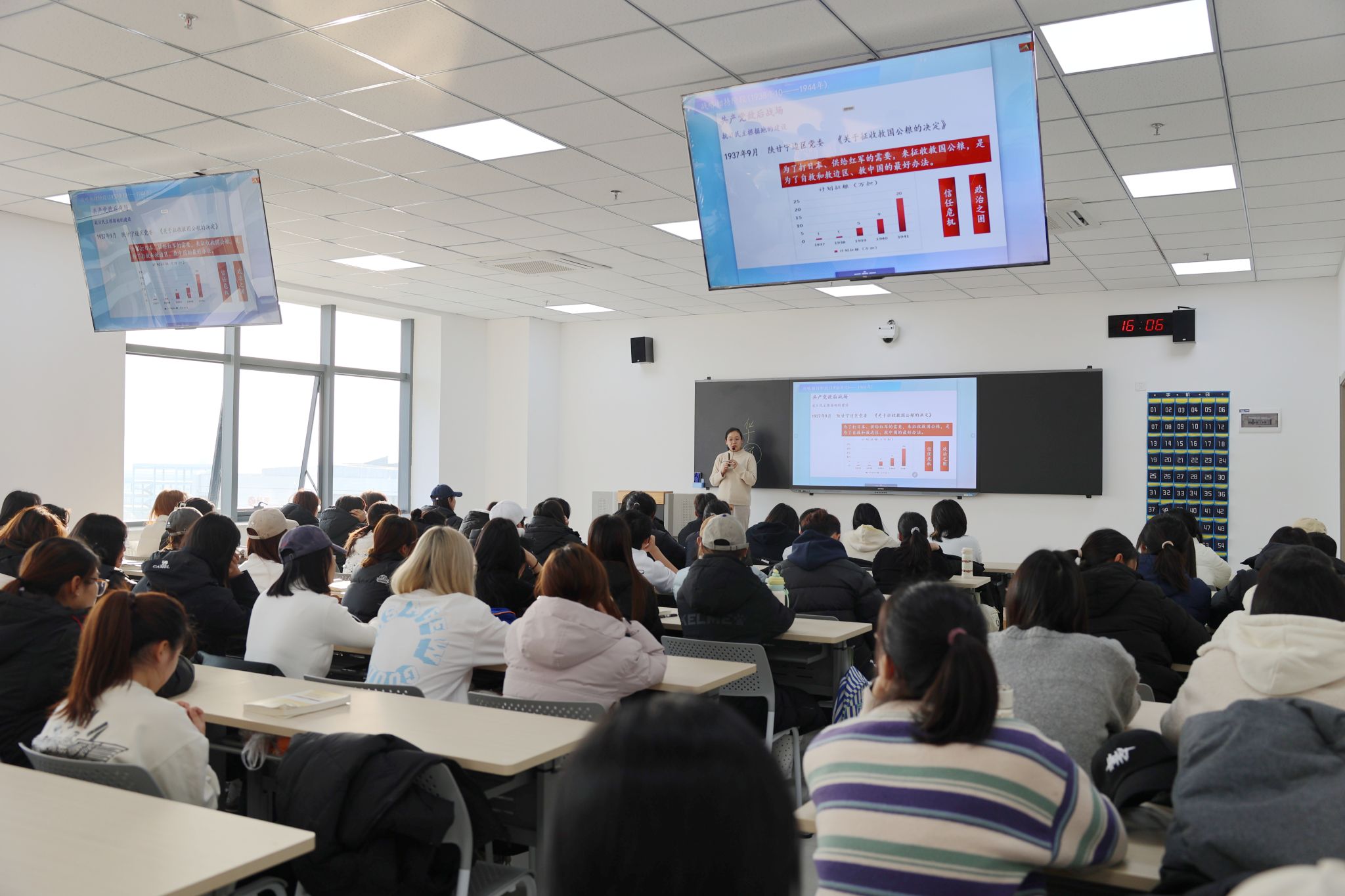 担任本次观摩公开课主讲的是马克思主义学院教师王昊斐,她以《中国近现代史纲要》课程中的第六章“中华民族的抗日战争”第四节“抗日战争的中流砥柱”为主题,将历史与现实紧密结合,准确把握教学的重难点,通过详细剖析抗日战争时期中国共产党在民族危亡关头所发挥的中流砥柱作用,生动展现了中国共产党人的英勇无畏和坚定信念,激发了学生们的爱国热情与学习兴趣。在教学过程中,她充分运用数字化教学工具,精心设计互动环节,丰富了教学手段,提高了教学效率,引导学生积极参与课堂讨论,鼓励学生发表自己的观点和看法,提升了学生的获得感,取得了良好的课堂效果。