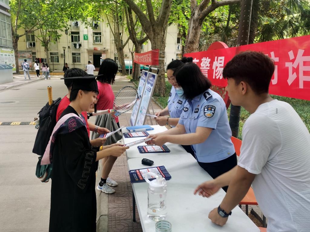 本网讯    为进一步提高我校师生员工安全防范意识,预防和减少各类电信诈骗案件的发生,维护师生的切实利益,5月17日,我校联合红缨路派出所开展反电信网络诈骗宣传活动。红缨路派出所魏娜警官,我校保卫处副处长王刚、治安科科长祝博文等参加了活动。