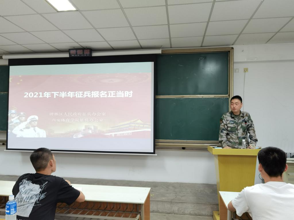 本网讯    为了鼓励大学生积极参军入伍,不断提升兵源素质、向军队输送高素质人才、推动国防和军队现代化建设,我校武装部邀请碑林区武装部参谋侯豪6月28日为我校应届毕业学生开展了“2021年下半年征兵报名正当时”专题征兵宣讲。