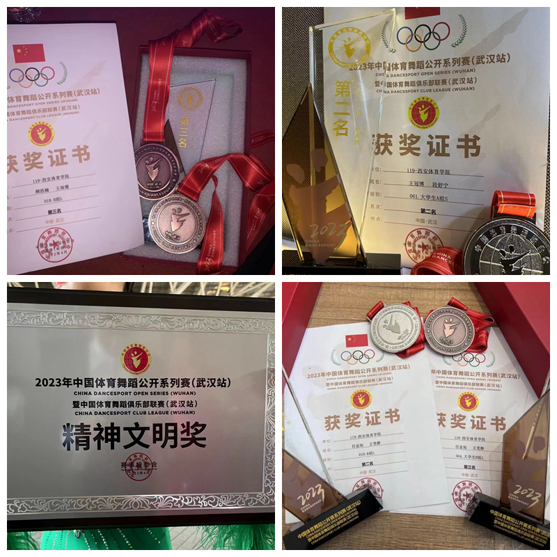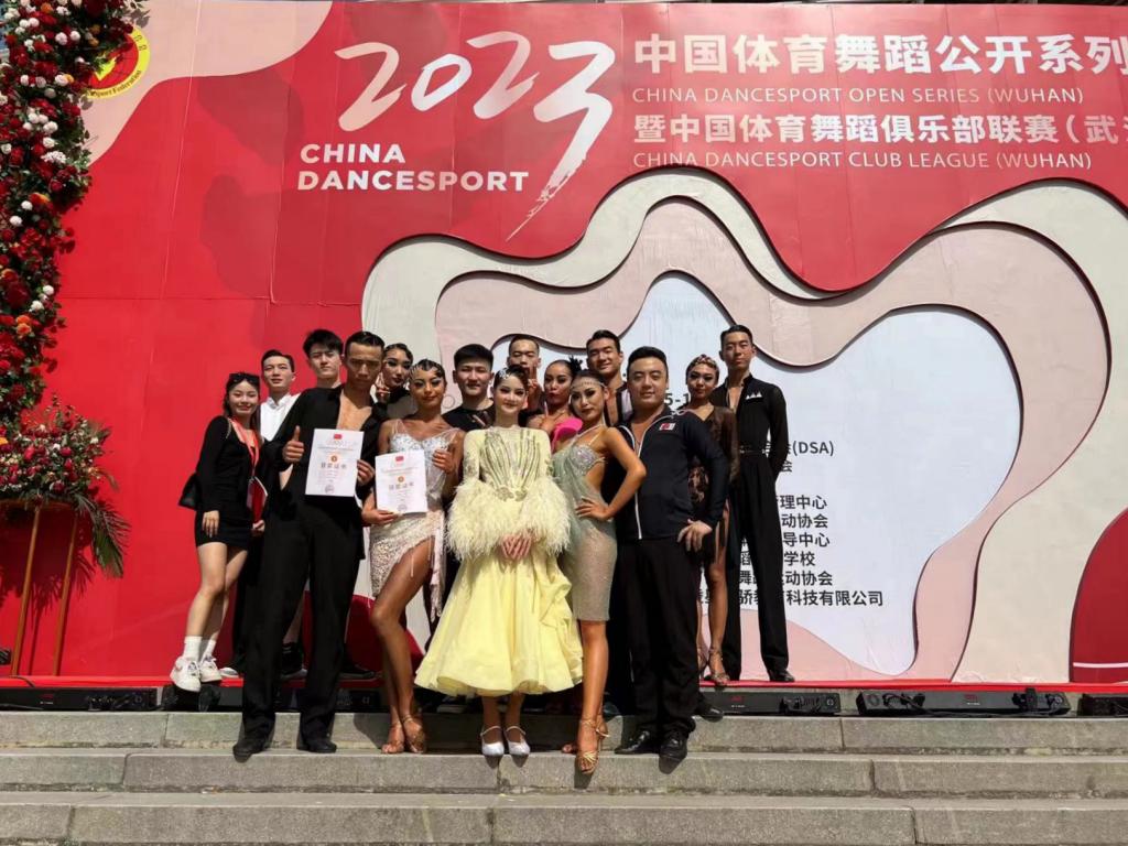 本次赛事是2023年中国体育舞蹈联合会举办的第一场全国赛事。我校体育舞蹈代表队由方鑫老师带队、共24名运动员参加了本次比赛。在学校及艺术学院的大力支持下,同学们一边参与大学生艺术节的排练,一边挤出时间积极备战武汉赛。最终经过两天的激烈角逐,我校代表队获得了1项第一名,3项第二名,1项第三名的优异成绩。其中张硕、王一莹获大学生组拉丁舞第一名;任金旭、王雯静获B组拉丁舞第二名、大学生B组拉丁舞第二名;王冠博、段舒宁获大学生组标准舞第二名;顾浩楠、王雨珊获B组拉丁舞第三名;与此同时,因我校学子奋勇争先、顽强拼搏,赛出了竞技水平,赛出了道德风尚,赛出了个性风采,赛出了团结友谊,展现了良好的精神风貌,我校被授予“精神文明奖”荣誉奖牌,在全国赛场上为校争光添彩。