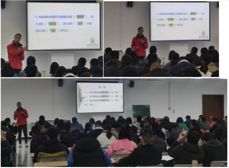 本次活动特邀我校李山教授为参训老师作题为《青少年体育训练科学化指南》的专题报告。李山老师从青少年体能训练理论必备的1项“理论”、青少年体能训练过程设计的2大“模型”、青少年体能高效训练计划的3个“板块”,采取理论讲座与现场示范相结合的方式为参训人员讲授了精彩的一课。
